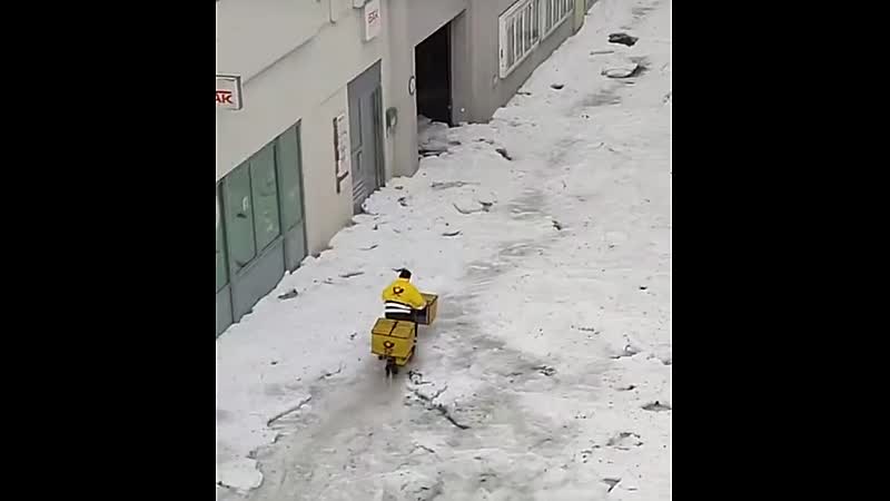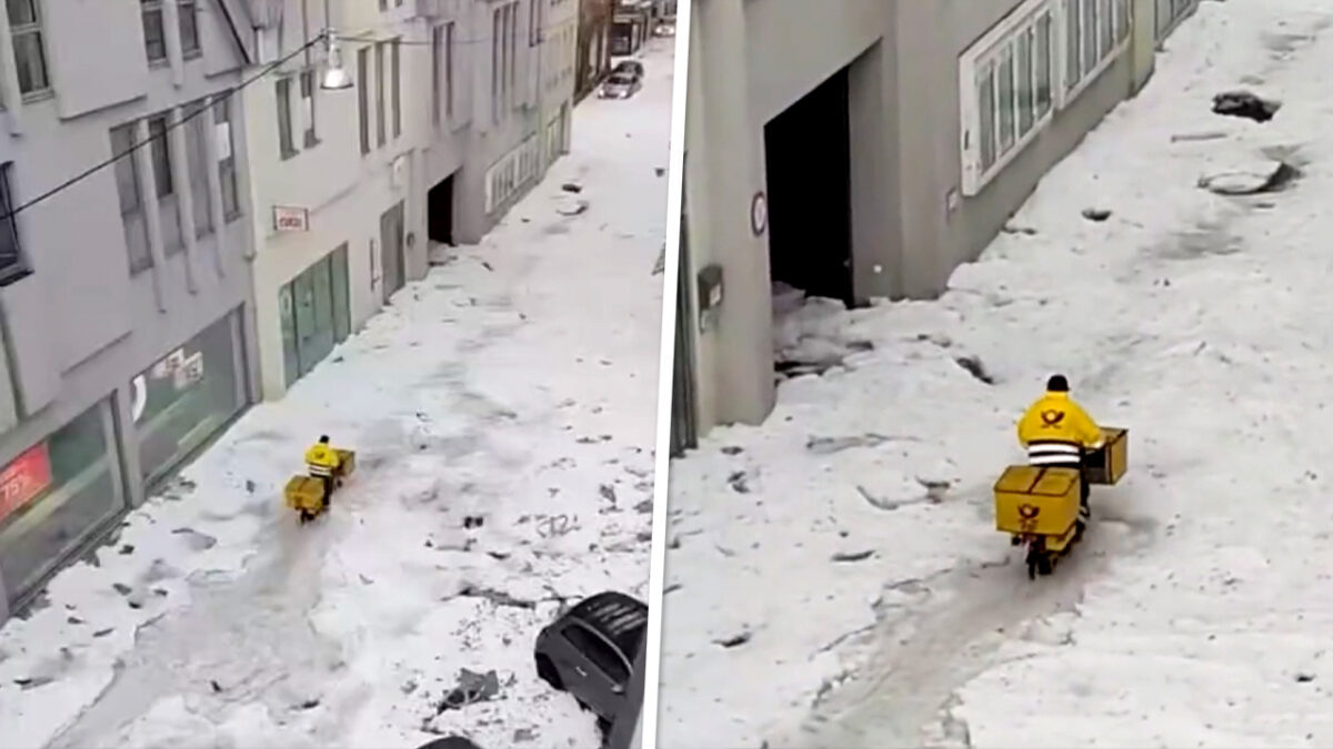 Geen idee of ze bij de Duitse post een medewerker van de maand kiezen, maar als 'iemand hem deze keer verdient dan is het deze postbode. Het mag dan wel zomer zijn, maar daar merk je niet alleen in Nederland, Italië en Slovenië vrij weinig van; harde regenbuien en hagel zorgden voor een winters landschap maar dat weerhoudt deze bikkel er in ieder geval niet van om toch aan het werk te gaan. 💪