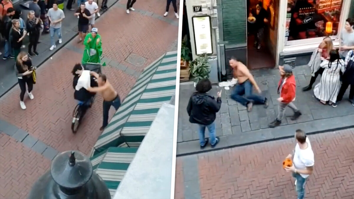 Superleuk natuurlijk; van die #dronken toeristen die de weg versperren maar daar zat deze fietsende Amsterdammer (hoogstwaarschijnlijk import) blijkbaar niet echt op te wachten. Als 'ie dan ook nog eens fysiek wordt belaagd door lollige Henkie stapt 'ie rustig van zijn fiets om een goedgemikte pimp slap uit te delen.