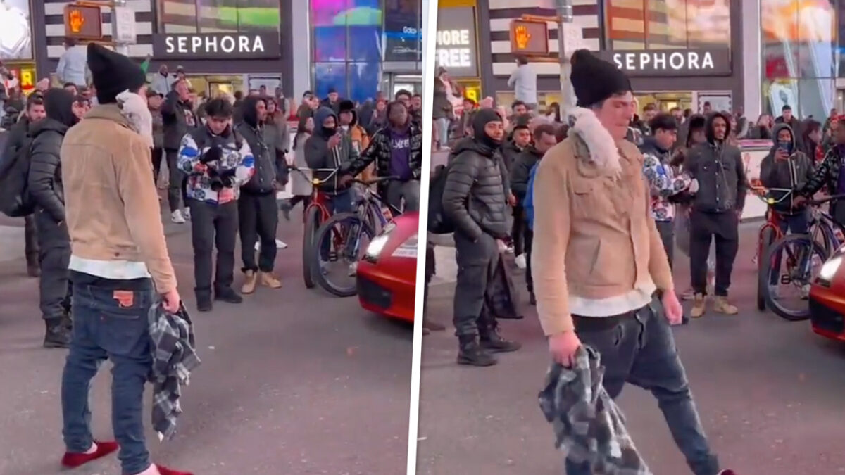 Deze meneer is niet zo dol op lawaaierige sportwagens en blokkeert de weg