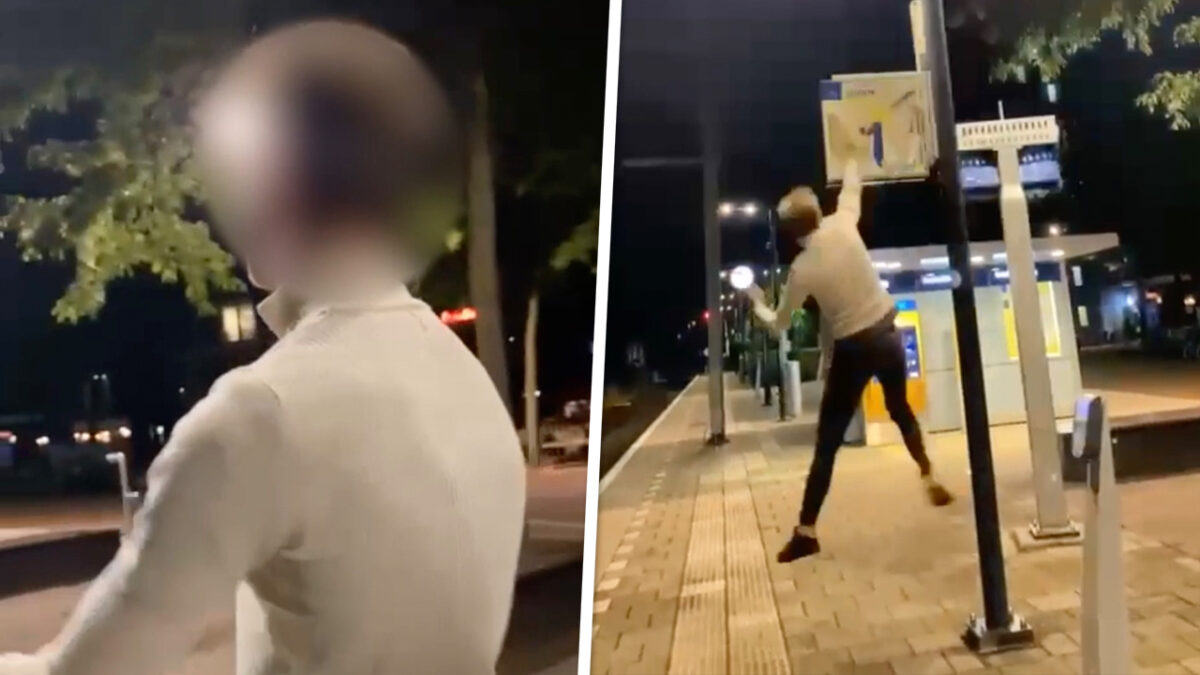 Altijd lachen met Thomas; na een avondje stappen moest er toch nog even een bordje gesloopt worden op het station van Ede. Gelukkig is 'ie wel goed opgevoed en ruimt hij z'n rommel wel netjes op.