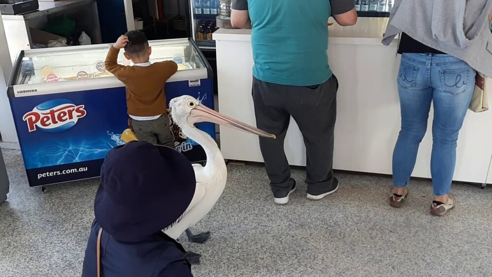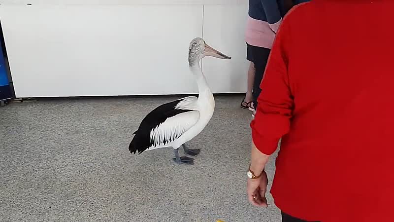 Extreem geduldige pelikaan wacht keurig op zijn bestelling bij een Fish 'n' Chip zaak
