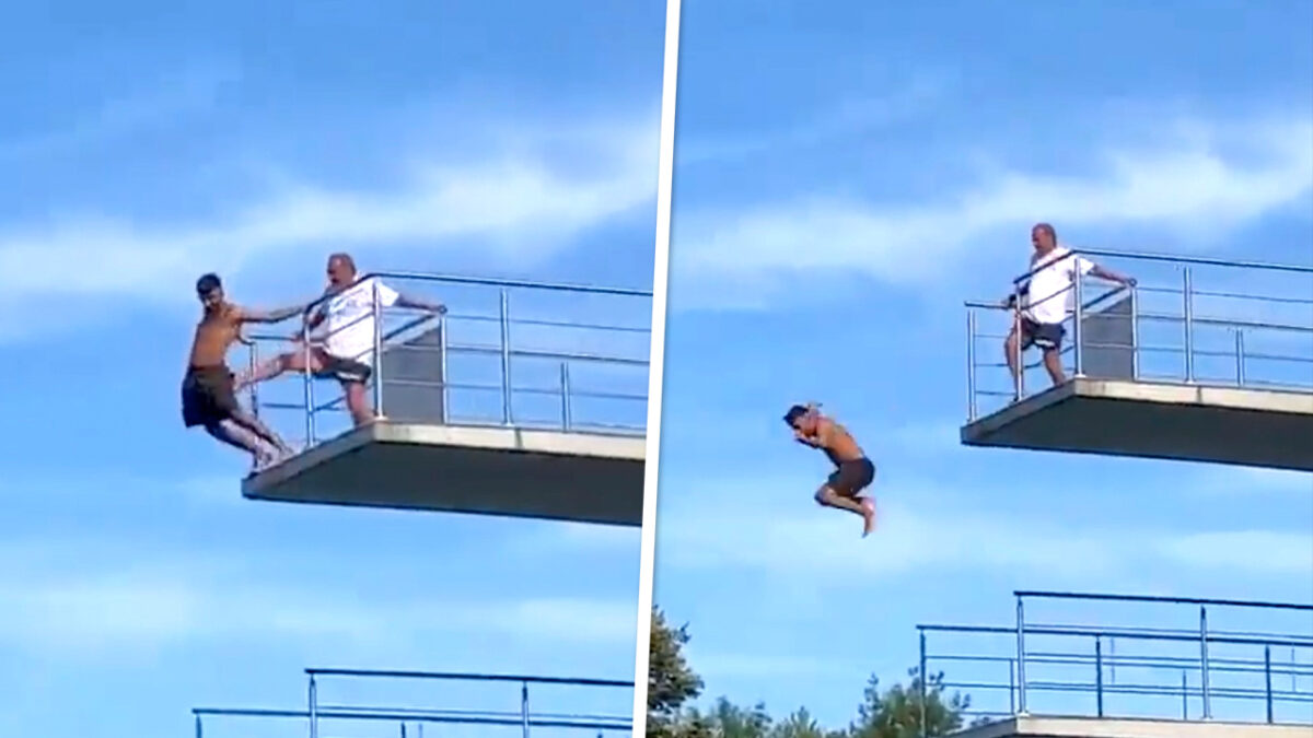 Het incident haalde al half augustus al de Oostenrijkse krantenkoppen, maar er is nu een video op social media is opgedoken waarin te zien is hoe hij zich probeert vast te houden. Naar verluidt zou hij, eenmaal boven aangekomen, niet meer durven te springen maar daar had deze badmeester blijkbaar geen boodschap aan.