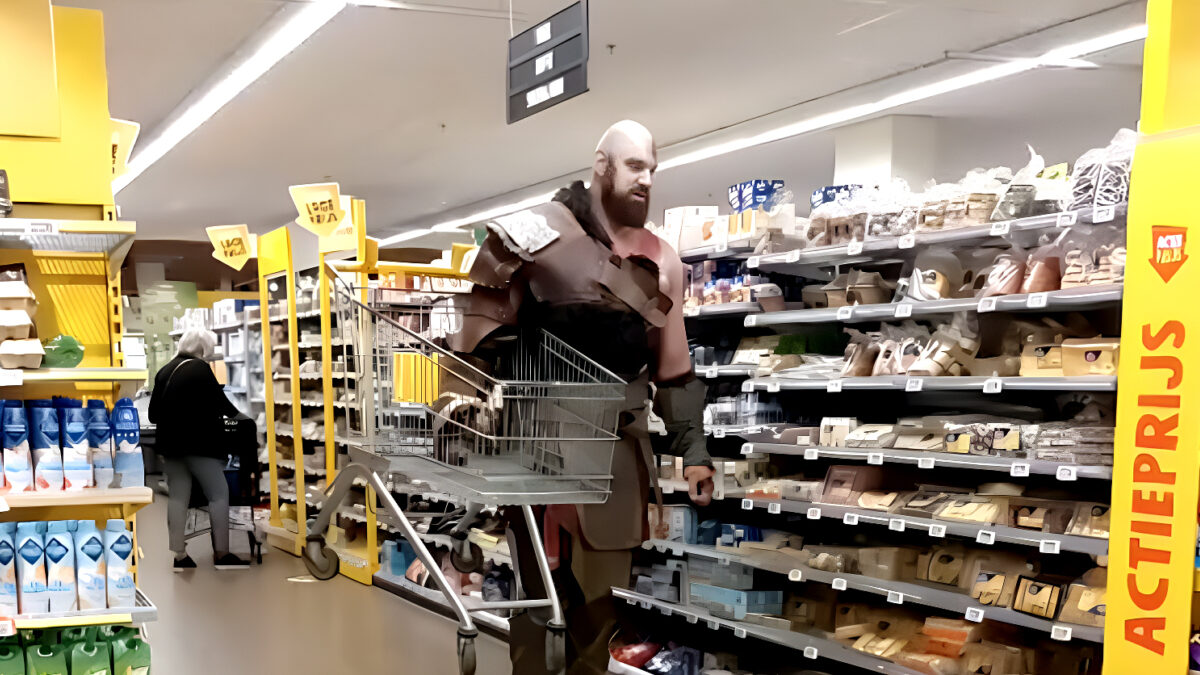 Olivier RichtersThe Dutch Giant Kratos heeft blijkbaar nog niet zo vaak boodschappen gedaan met een winkelwagen, maar dat weerhoudt hem er niet van om even wat inkopen te doen.