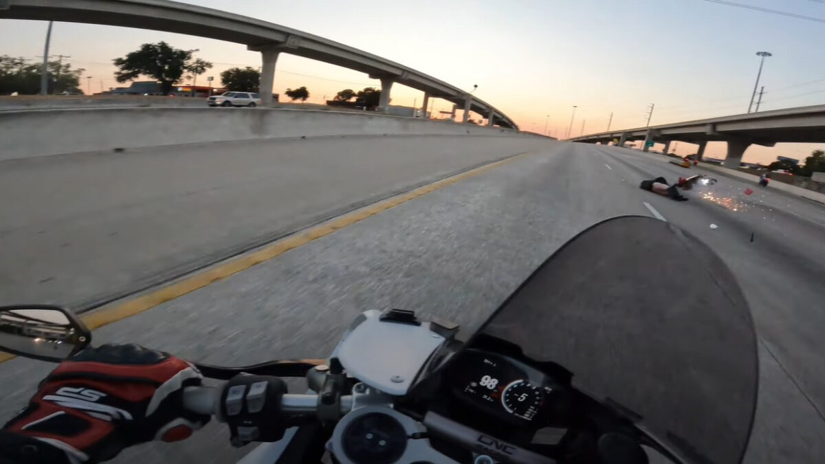Een motorrijder moet vol op de rem als hij met 160 km/u aan komt racen en niet doorheeft dat voor hem iemand wil afslaan. Hij komt uiteindelijk lelijk ten val en zijn motorkleding laat ook te wensen over. Gelukkig kon de filmer net op tijd uitwijken om een ernstiger ongeval te voorkomen. Ondanks de lompe val had 'ie wel geluk dat er geen botten waren gebroken, maar hij liep uiteraard wel flinke schaafwonden op. 👀