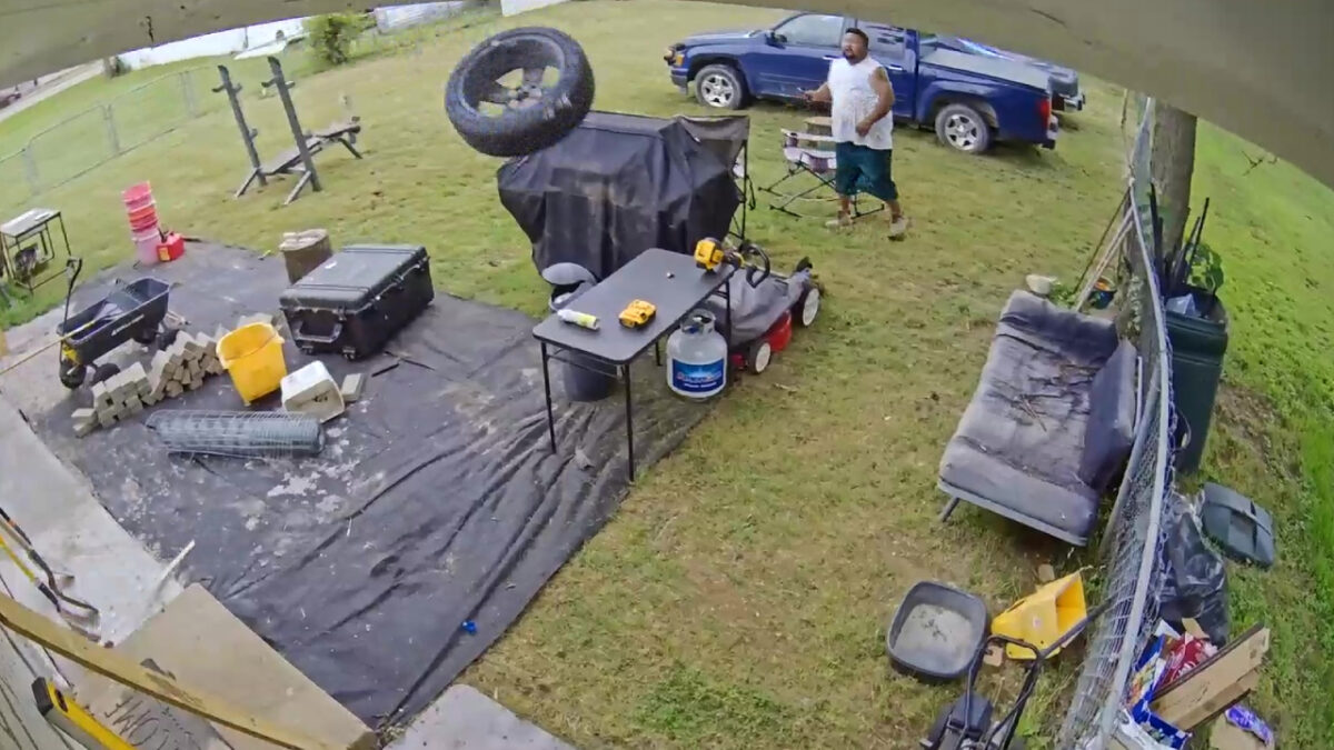 Tijdens het klussen in de tuin kun je een heleboel verwachten, maar een losgeslagen wiel dat met een noodgang aan komt vliegen? Nee, dat maak je niet zo vaak mee.
