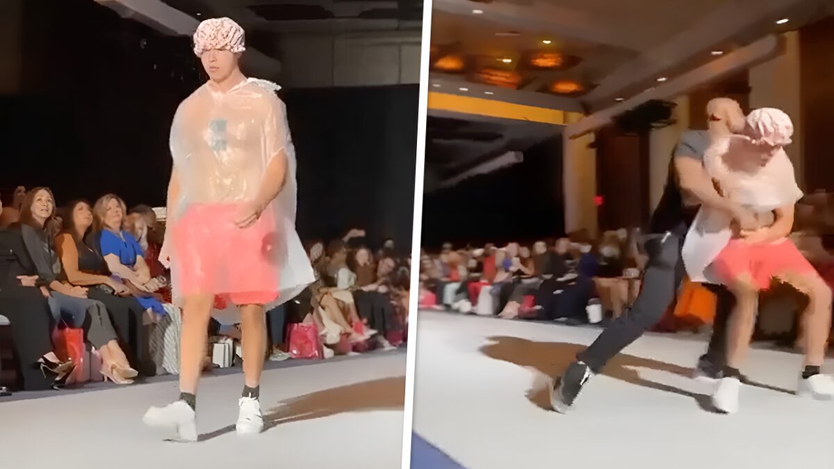 Aangezien ze tegenwoordig op de catwalk de gekste creaties dragen valt het natuurlijk niet eens op als je sneaky de show steelt met je badmuts en vuilniszak. Deze grapjas probeerde het uit en pakte zijn 12 seconds of fame.