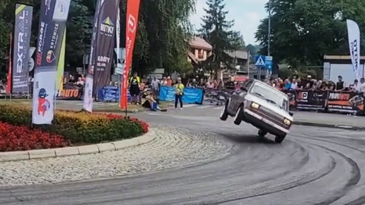 Tijdens de rally van Ustron (Polen) ging deze deelnemer net even iets te hard op de rotonde af, waarna het even helemaal mis leek te gaan. Echter, dankzij bliksemsnelle reflexen zat hij zo weer in de race!