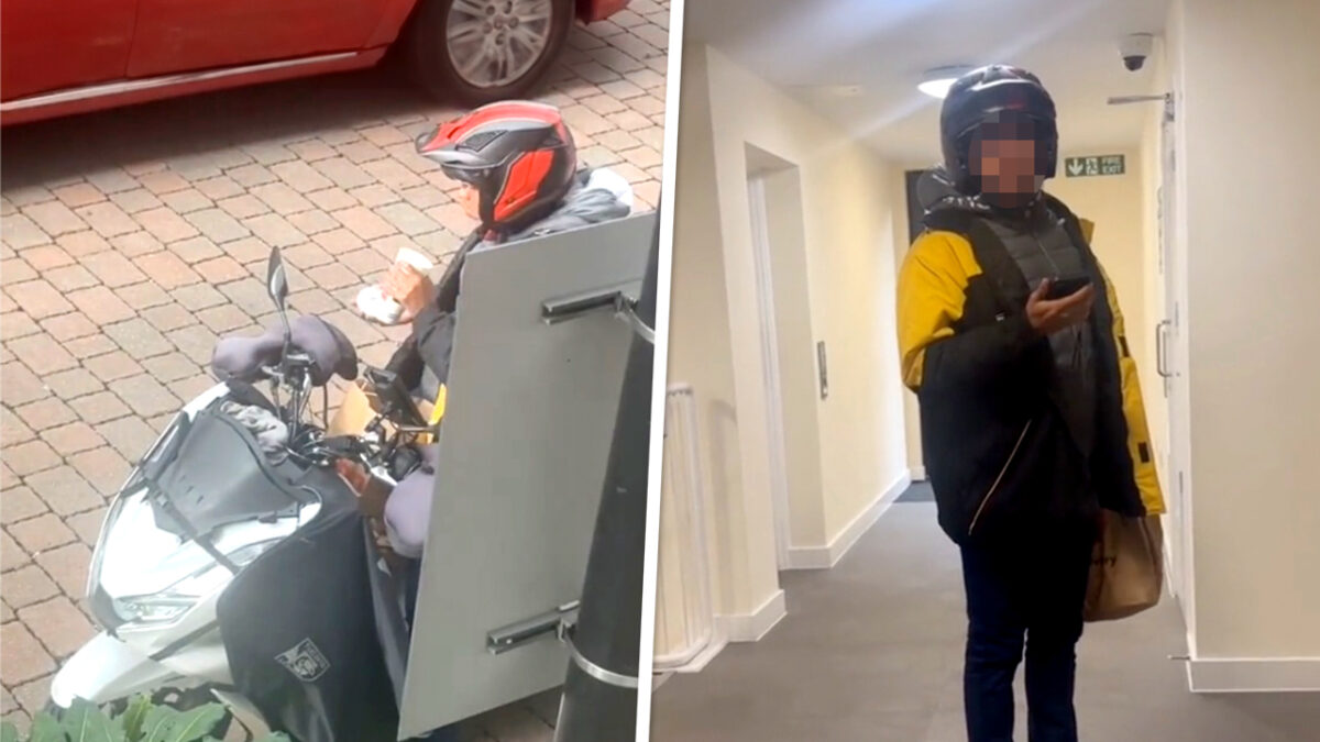 Uber Eats-bezorger heeft dorst en drinkt lekker uit bestelling van een klant