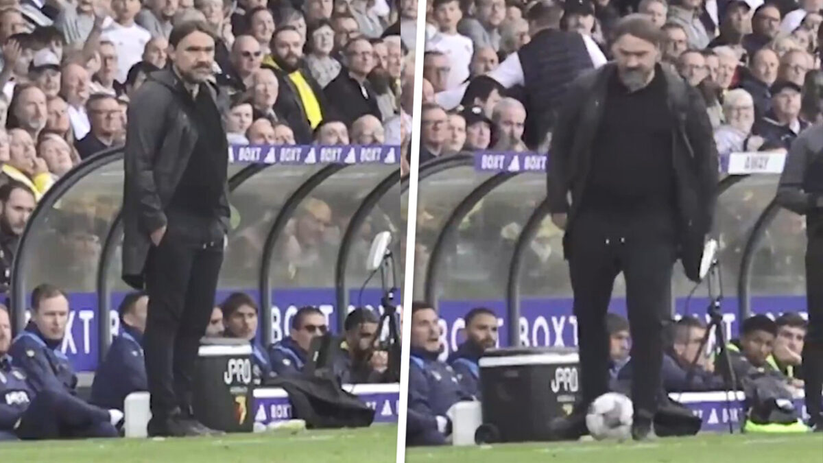 Leeds United-trainer Daniel Farke laat zien hoe je een bal aanneemt