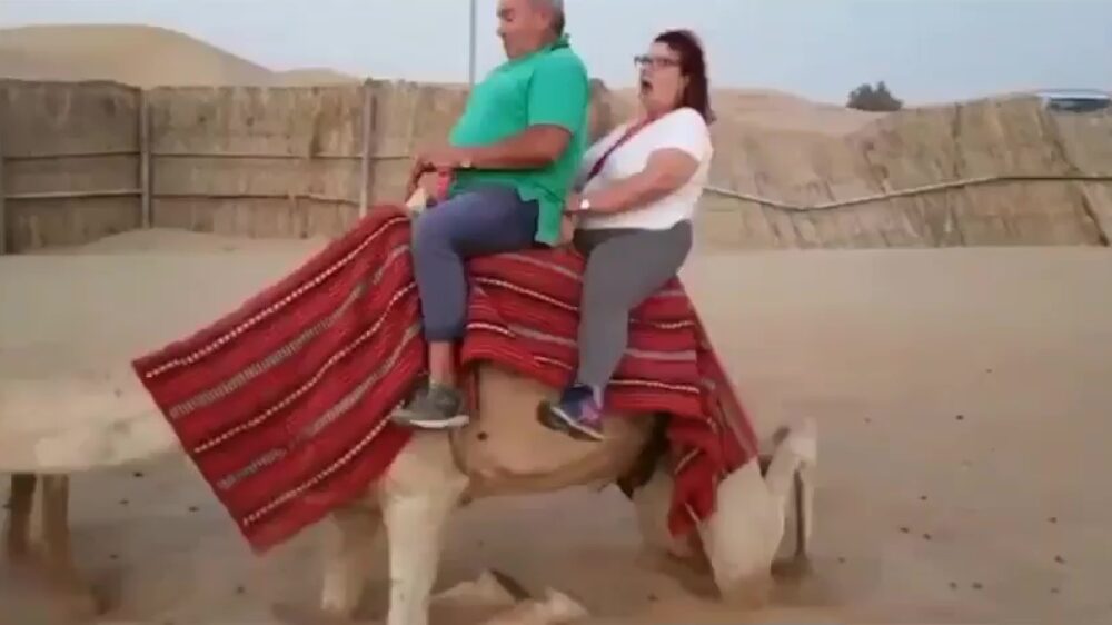 Het lijkt allemaal leuk en romantisch, zo'n kamelenritje door de woestijn, maar elke imbeciel kan zich indenken dat als je met 2 vetnekken op zo'n beestje gaat zitten, dat die daar niet blij mee is. Dit schip der woestijn zorgt er dan ook voor dat dit duo een ritje krijgt om nog lang over na te praten.
