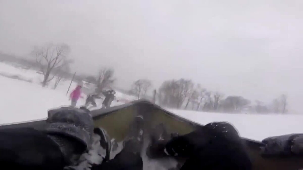 In een boot van een besneeuwde berg afknallen is niet zonder gevaar Fails