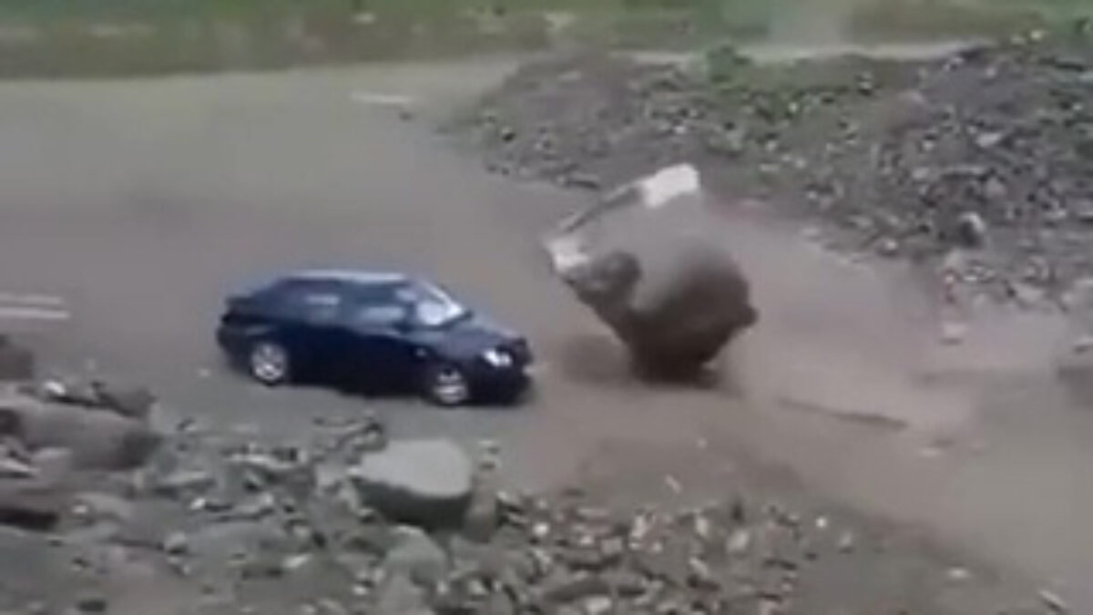 Automobilist wordt net niet verpletterd door rotsblok Random