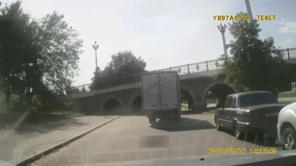 Vierkante vrachtwagenchauffeur probeert onder een ronde, lage brug door te rijden