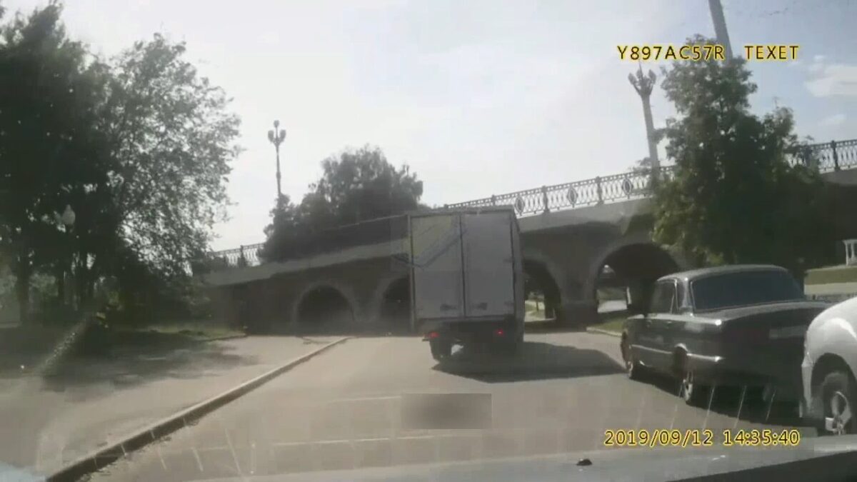 Vierkante vrachtwagenchauffeur probeert onder een ronde, lage brug door te rijden Verkeer