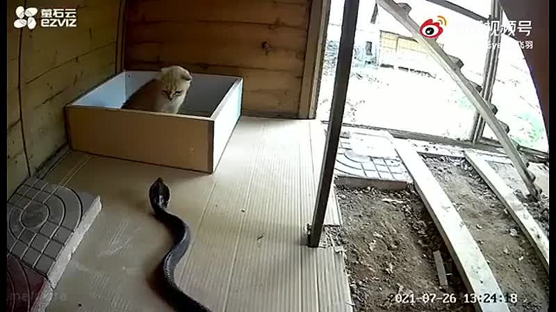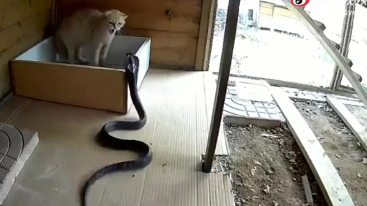 Kat blijkt totaal geen angst voor enorme cobra te hebben