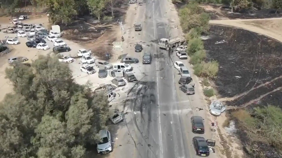 Dronebeelden laten zien hoe het Israëlische festivalterrein er na de aanval van Hamas uitziet