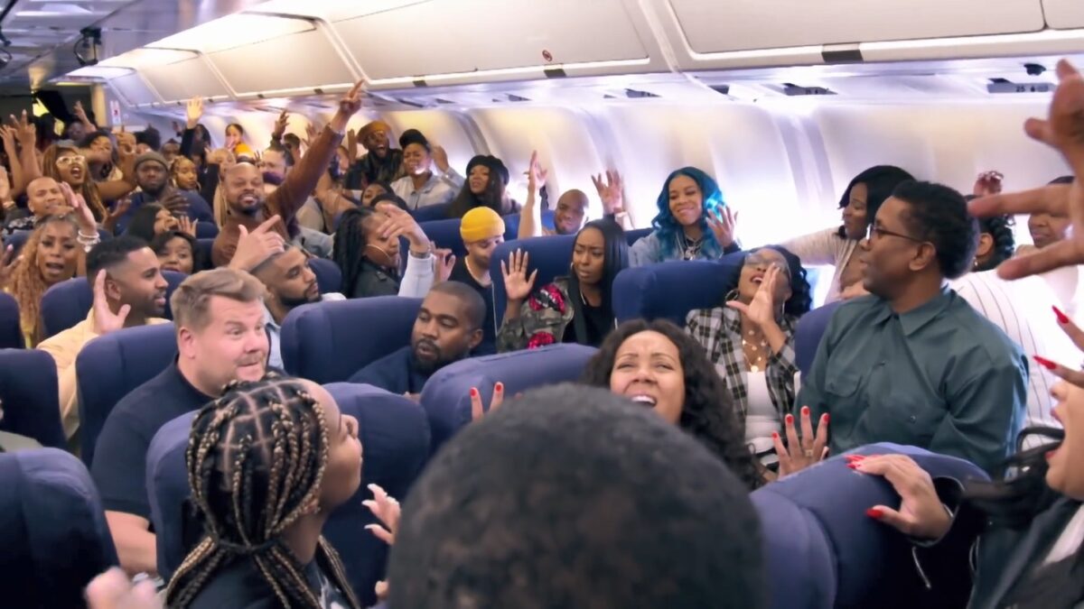 Kanye heeft een nieuwe cd 'Jesus Is King' en die moet natuurlijk gepromoot worden. Ye doet dit door mee te doen aan het populaire carpoolkaraoke van talkshowhost James Corden, maar hij stapt niet in een auto maar neemt zijn koor mee het vliegtuig in.