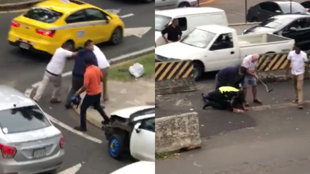 Blijkbaar werd opa beroofd van zijn Rolex, en alhoewel het échte corrigerende werk door omstanders en agenten gedaan wordt is de oude baas niet te beroerd om nog even een corrigerende tik na te geven met zijn wandelstok.