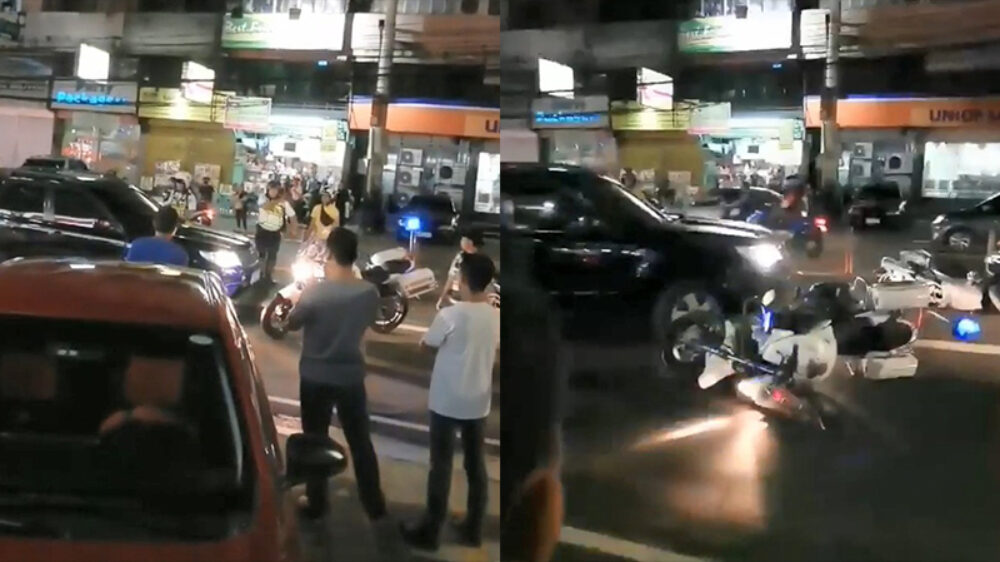 Troela in SUV heeft geen zin om naar ome agent te luisteren en beukt politiemotor omver