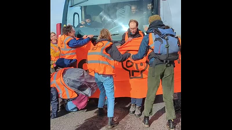 Een aantal Just Stop Oil-demonstranten probeerden dit te verhinderen maar deze buschauffeur reed gewoon door. Daar was de organisatie van JSO duidelijk niet over te spreken.