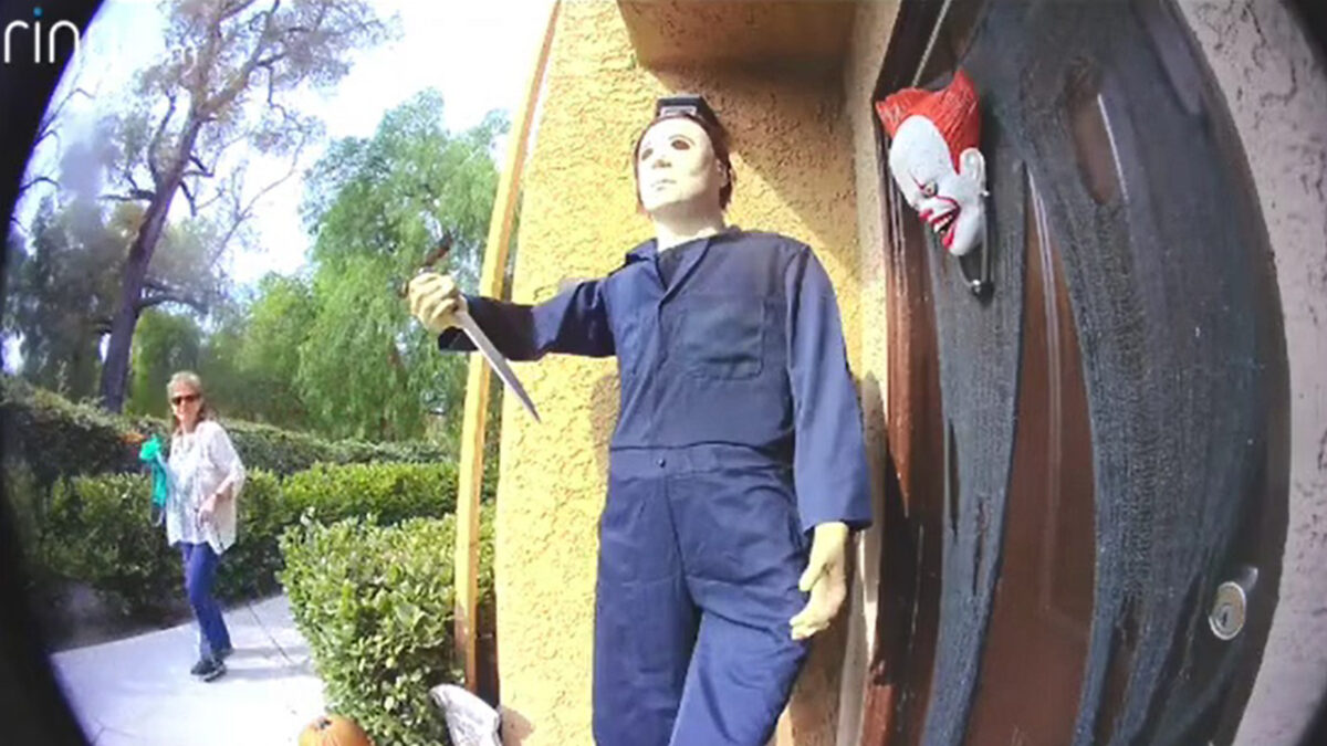 De buurvrouw is behoorlijk onder de indruk van deze Halloweenversiering