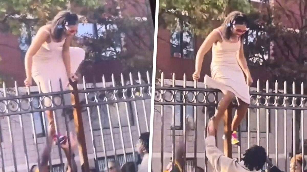 In een jurk over een hek klimmen is nog een hele uitdaging