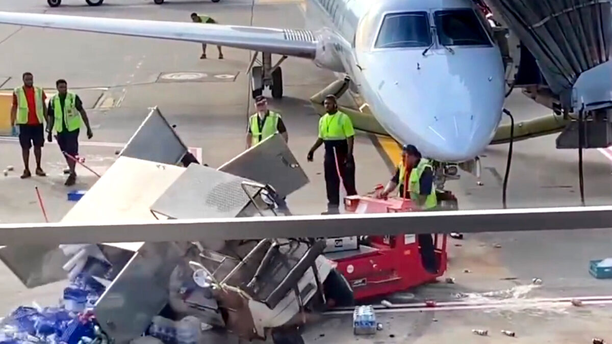 Toch lullig als je heel decadent met je privéjet op Ibiza bent geland en er een of ander op hol geslagen transportkarretje vol tegenaan klapt. Gelukkig is er één medewerker die weet hoe je dit varkentje moet wassen.