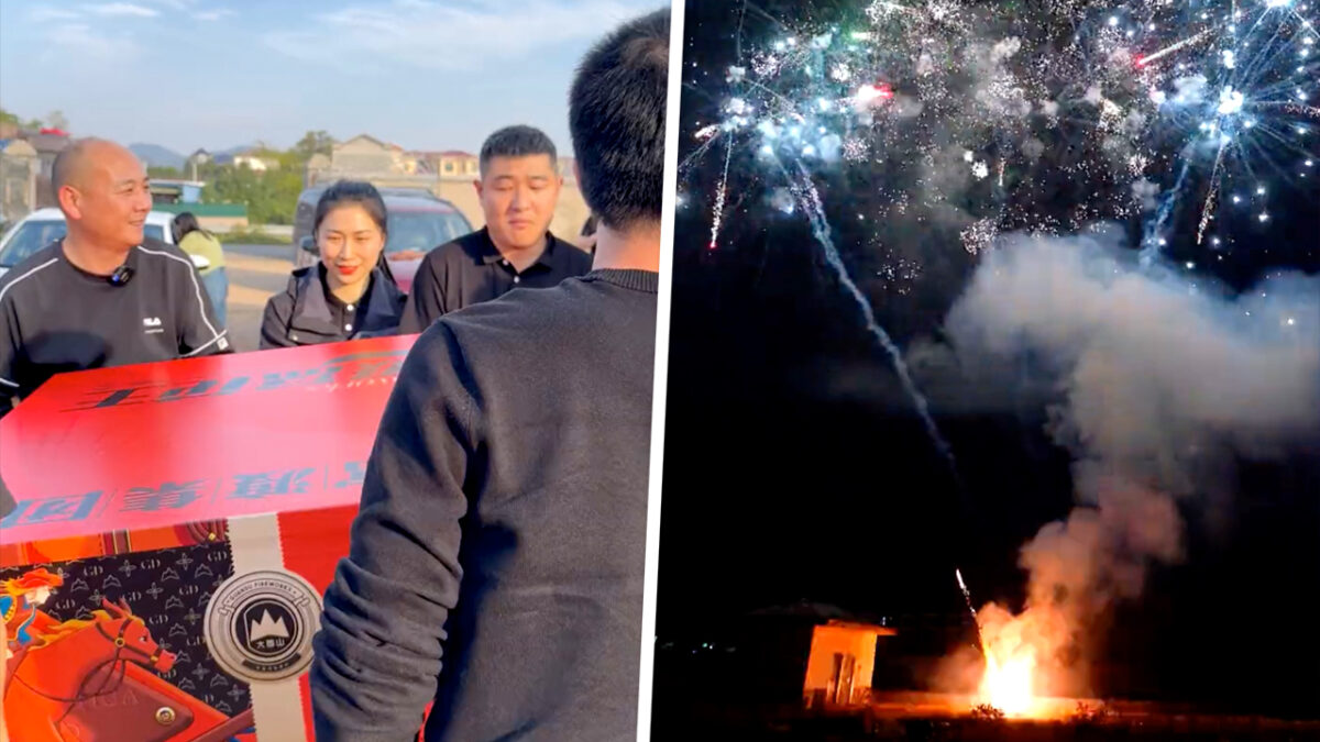 Chinezen demonstreren de kracht van hun gigantische vuurwerkcake