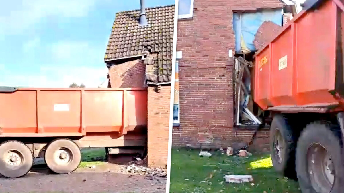 Via WhatsApp werden wij op deze video geattendeerd waarbij een zogenaamde landbouwkipper/dumper dwars door de voorgevel van een huis in de Groningse buurtschap Holte is gereden. De chauffeur is gelukkig ongedeerd, maar zoals 'ie zelf ook al zegt heeft hij wel een probleem.