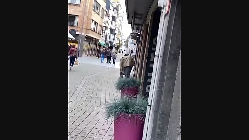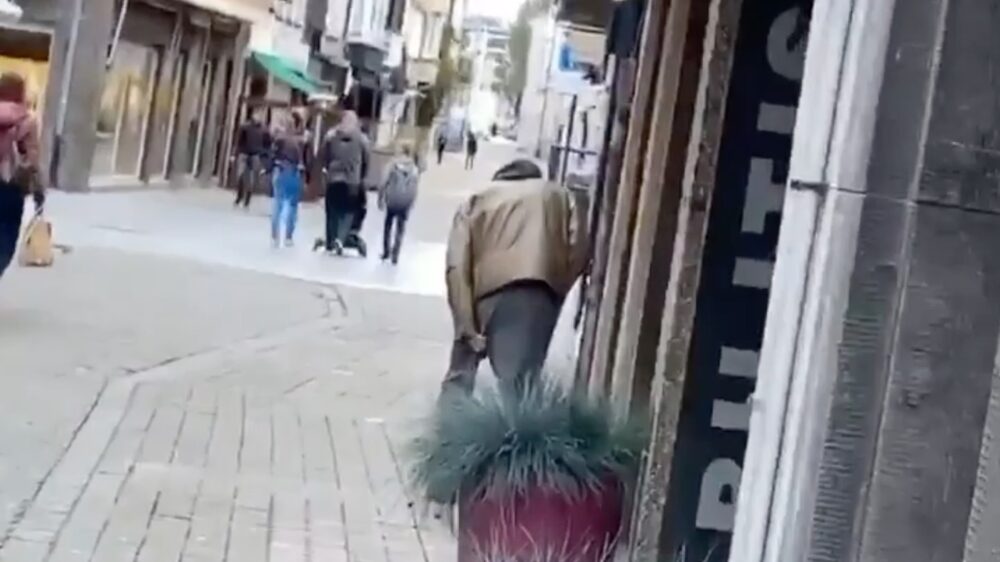 Belgische straatkakker schudt in een winkelstraat wat verse vlaaien uit zijn broekspijp