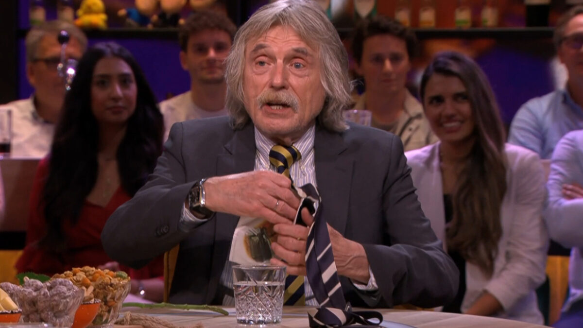 Johan Derksen krijgt van 85-jarige vrouw een wel héél pikante stropdas cadeau