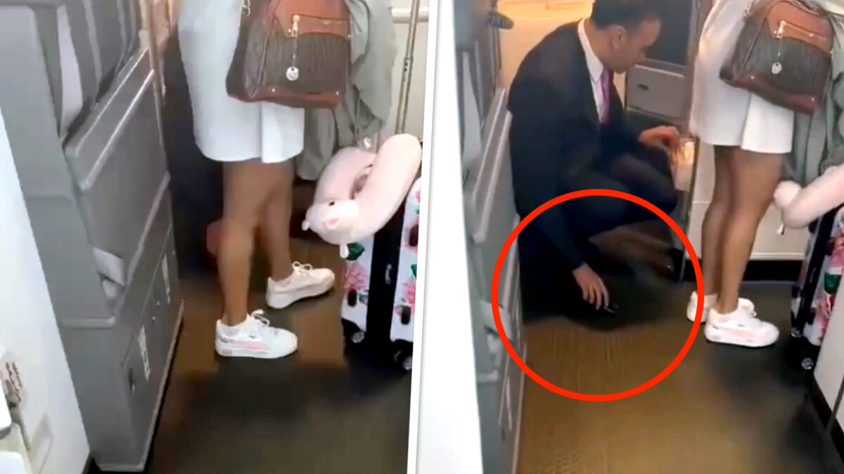 Een passagier filmde het acht seconden durende incident, waarbij de steward in hurkende positie zat en met één hand een mobiele telefoon met de camera naar boven gericht hield, terwijl hij met zijn andere hand door een voedselkar rommelde.