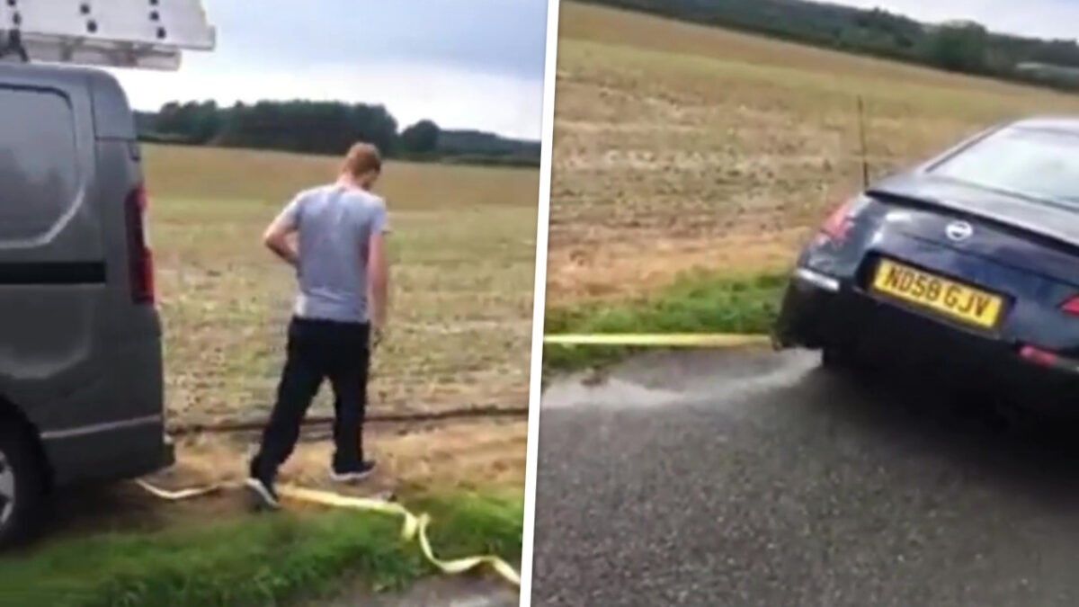 Deze man dacht te stoppen en het vastgelopen busje los te trekken uit de berm. Erg sympathiek, maar het touw vastmaken aan je bumper bleek niet het allerbeste idee aller tijden.