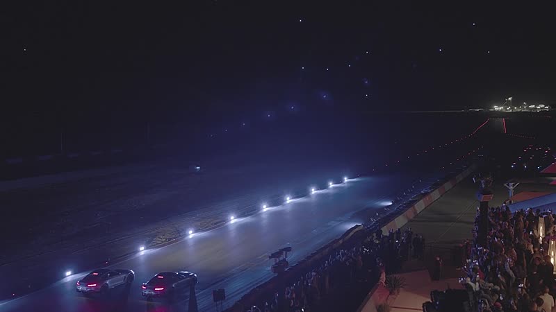 Lewis Hamilton en George Russell knallen door een tunnel van drones in Las Vegas