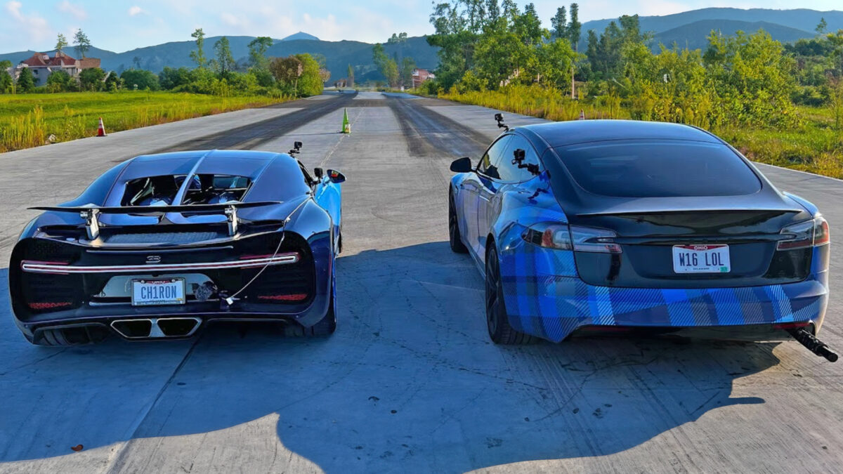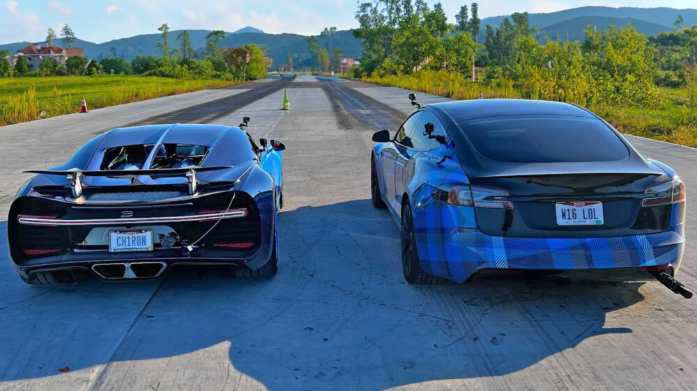 Tesla Model S Plaid veegt vloer aan met Bugatti Chiron van 4 miljoen dollar