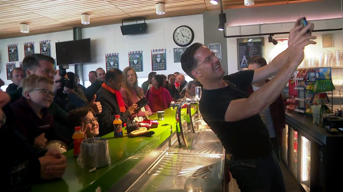 Ex-minister-president Mark Rutte probeert stemmen te winnen in de voetbalkantine