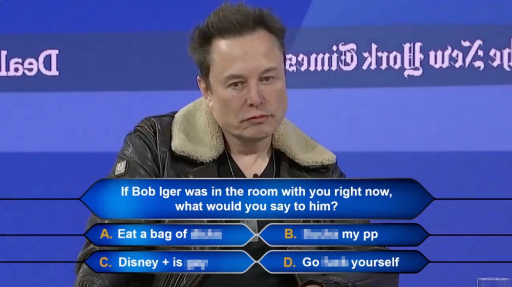Na zijn viral video waarin Elon Musk adverteerders als Walt Disney, IBM en Apple vertelde dat hij niet gevoelig is voor hun ordinaire chantagepoging, en veel mensen hun Disney+-accounts zouden hebben opgezegd, is video-editor Lofti Pixels zo creatief geweest om er een uitzending van het populaire tv-programma "Who Wants to Be a Millionaire?" van te maken.