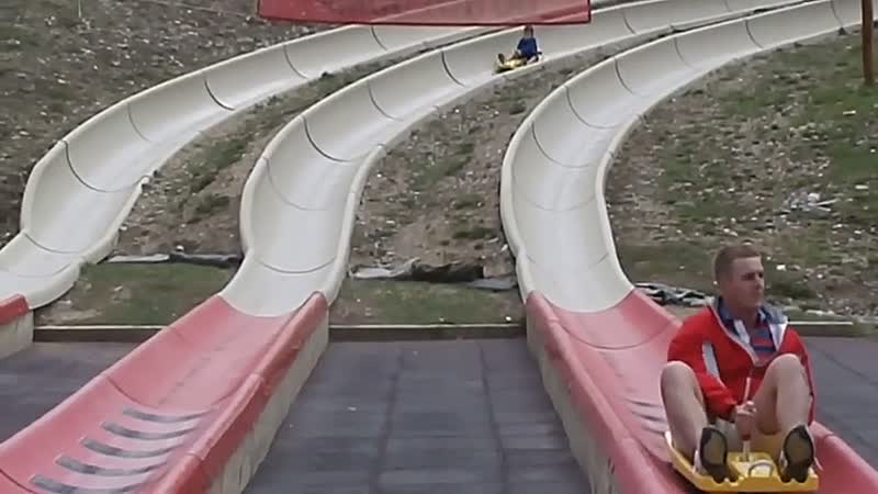 Het is de bedoeling om aan het eind van de rodelbaan te remmen zodat je niet met volle snelheid tegen de stootkussens aan knalt, maar dat ging bij deze man door nog onbekende reden even helemaal verkeerd.