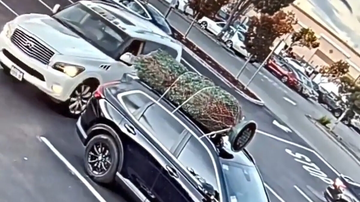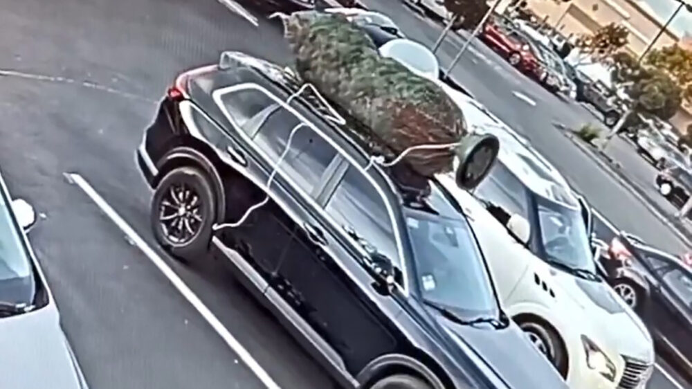 Vent wil geen moeite doen en trekt een kerstboom van iemands auto