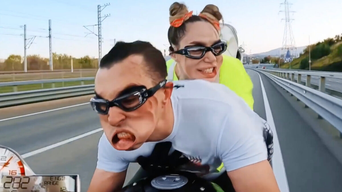 Deze twee tortelduifjes besluiten er nog een schepje bovenop te doen door ten eerste geen beschermende motorkleding te dragen en ook een helm vinden ze klaarblijkelijk totaal overbodig.