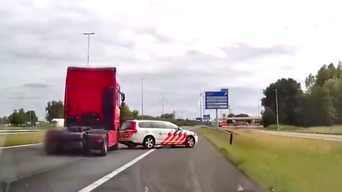 De beelden van dit hele spektakel dat vorig jaar plaatsvond zijn nu door de politie vrijgegeven. Toen deze vrachtwagen langs de kentekenplaatcamera's in de richting van de Belgische grens reed, kreeg de politie een melding dat die was gestolen. Ondanks dat ze de chauffeur een stopteken gaven, bleef hij rustig het gaspedaal indrukken, waarbij hij na een korte achtervolging op de politiewagen inreed.