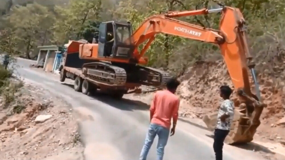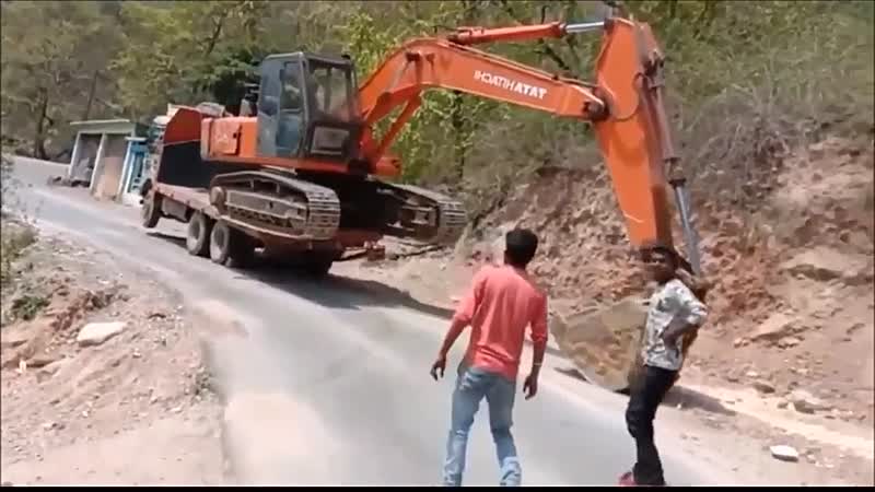 Graafmachine wordt op een spectaculaire manier van aanhanger gelost