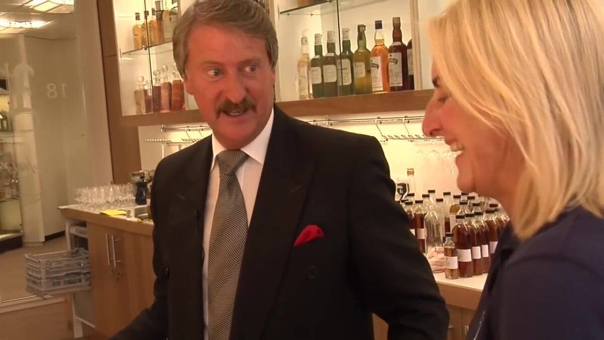 In de cola? Nekschot. Met ijs? Zweepslagen. Dan weet je dat vast. Richard Paterson legt je verder even uit hoe je whisky moet drinken, en zo te zien was dit niet zijn eerste drankje van de dag.