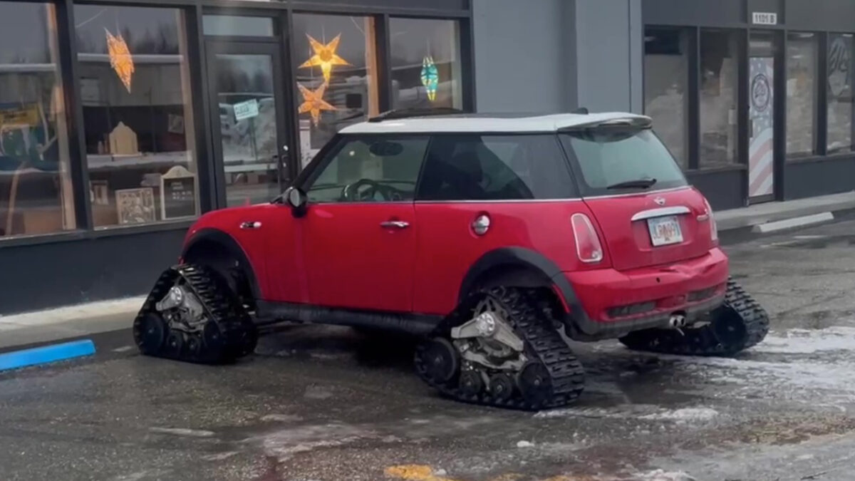 Een Mini Cooper is best een geinig gebakje, maar het enorme ladingen sneeuw kun je er niet zo veel mee. Tenzij je deze uitvoering aanschaft, dan kun je daar prima de snelweg mee op! Oké, het wordt wat minder prettig als er géén bult sneeuw ligt, maar een kniesoor die daar op let.