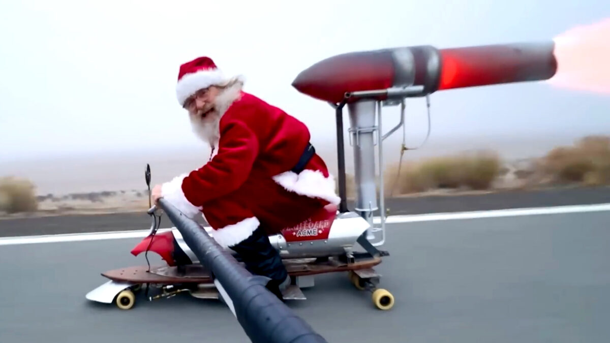 Vorig jaar leende hij de slee van de Kerstman om er een paar straalmotoren op te plakken om door de sneeuw te jakkeren, maar deze keer laat de winter een beetje op zich wachten en heeft 'ie een skateboard moeten ombouwen. Ach ja, werkt ook prima!