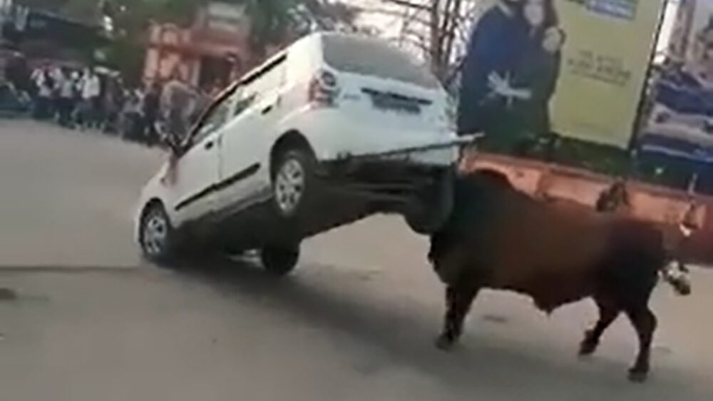 Behulpzame stier probeert auto met startproblemen aan te duwen