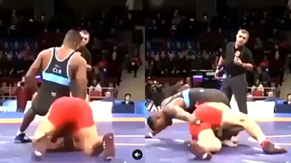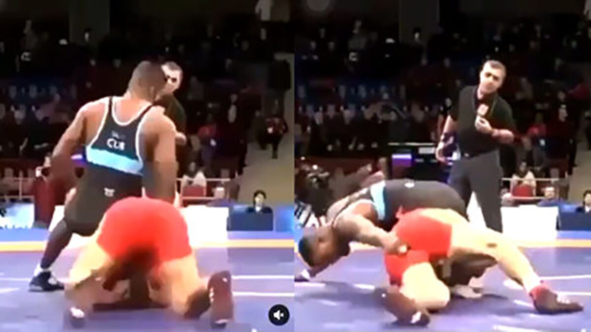 Worstelaar gebruikt gemene greep op zijn tegenstander
