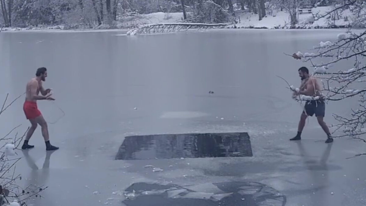 Touwtrekken is wellicht niet de meest spannende sport aller tijden, maar op deze manier wordt zo'n potje toch een stuk intenser. Zet twee koukleumen die absoluut niet in het koude water willen vallen tegenover elkaar en gaan met die banaan!