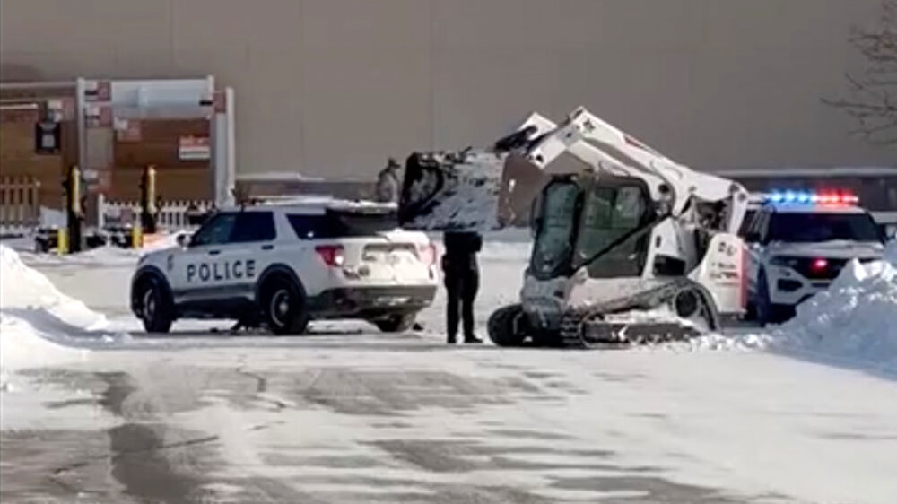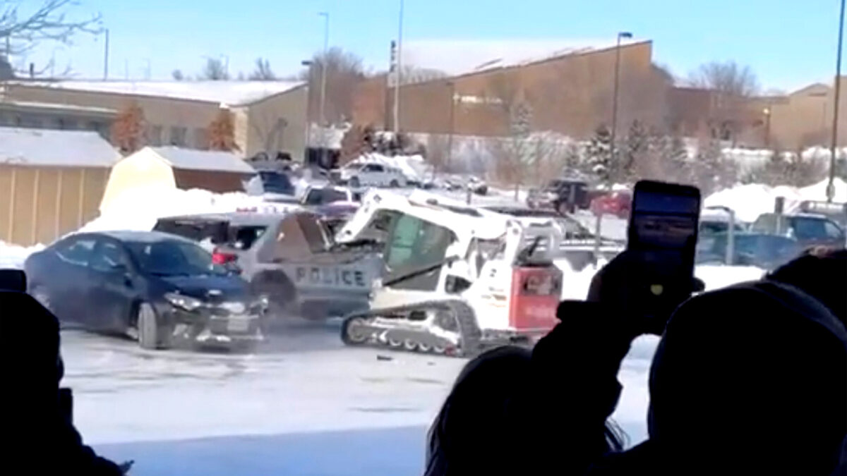 Man in bobcat draait door en sloopt politiewagen bij The Home Depot