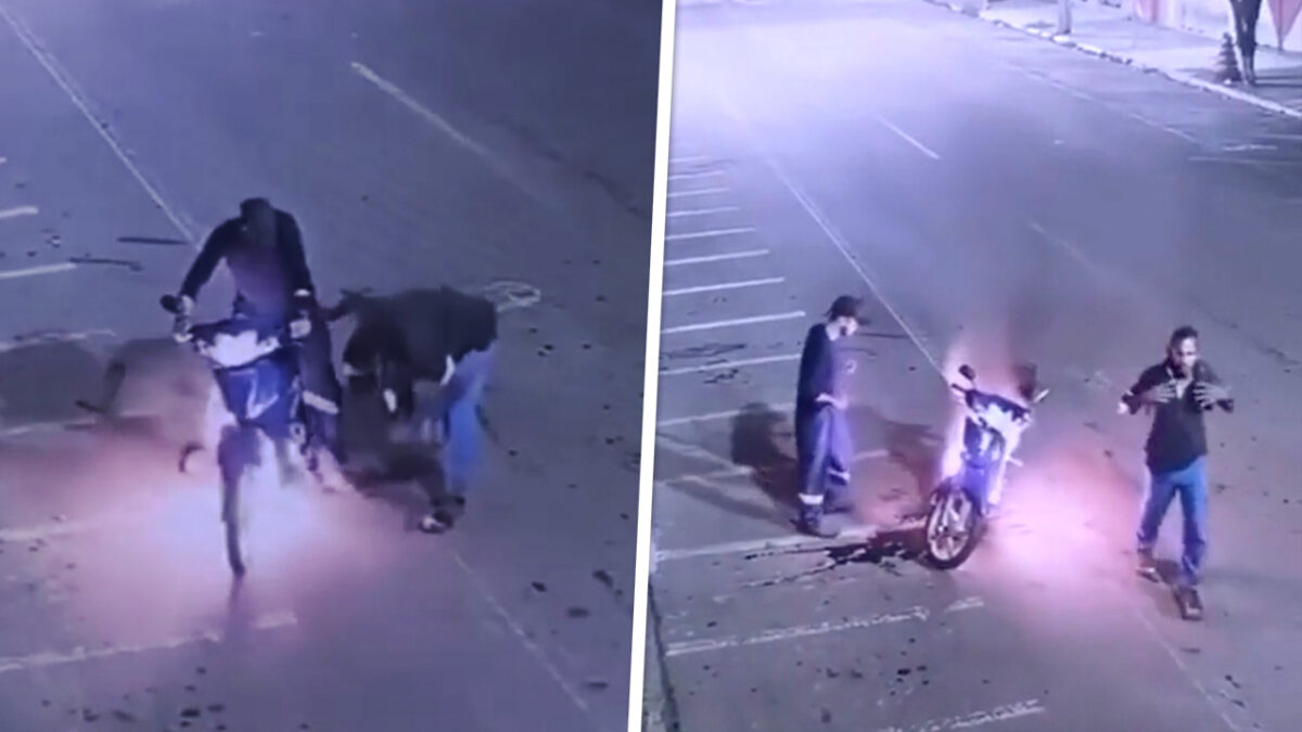 Twee creatievelingen uit Santo Domingo hoefden niet twee keer na te denken toen hun brommer spontaan in de fik vloog; ze haalden hun brandslangen tevoorschijn in de hoop met wat precisiewerk de brand te kunnen blussen.